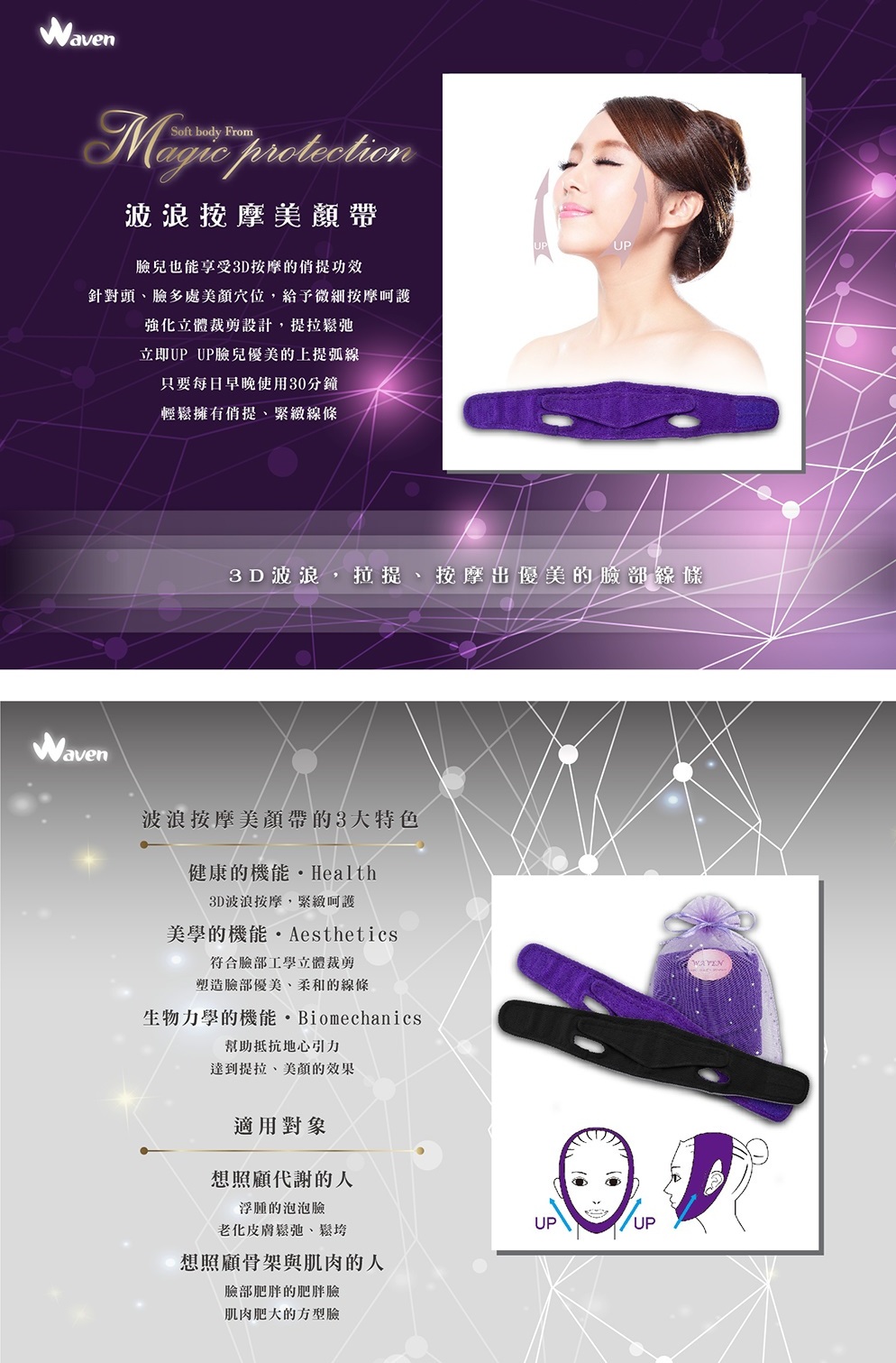 - 臉兒也能享受3D按摩的俏提功效,給予微細按摩呵護;強化立體裁剪設計,提拉鬆弛,立即UP UP臉兒優美的上提弧線,只要每日早晚使用30分鐘,輕鬆擁有俏提、緊緻線條。