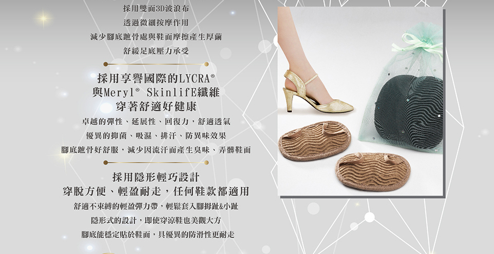 *3D波浪按摩織布,透過微細按摩作用,減少腳底蹠骨處與鞋面摩擦產生厚繭、舒緩足底壓力承受。