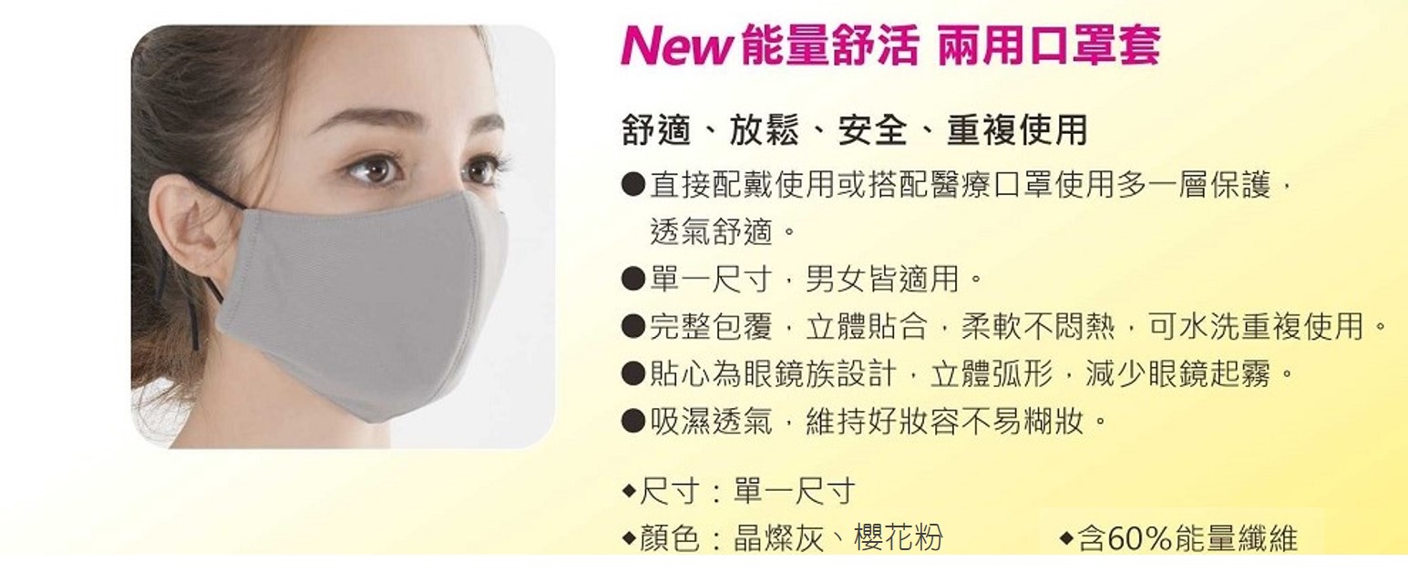 直接配戴使用或搭配醫療口罩使用,創新科技紡紗材質,質地透氣舒適,可水洗重複使用。