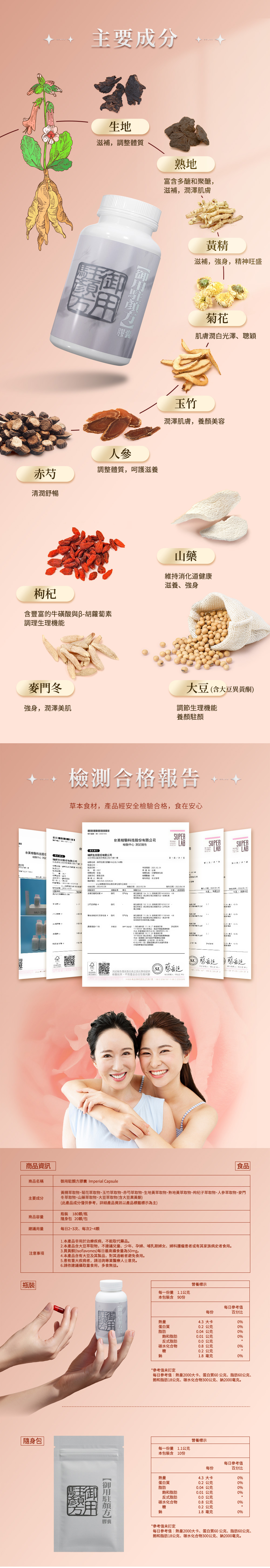 主要成分:生地萃取物、熟地萃取物、黃精萃取物、人參粉、山藥萃取物、大豆萃取物(含大豆異黃酮)